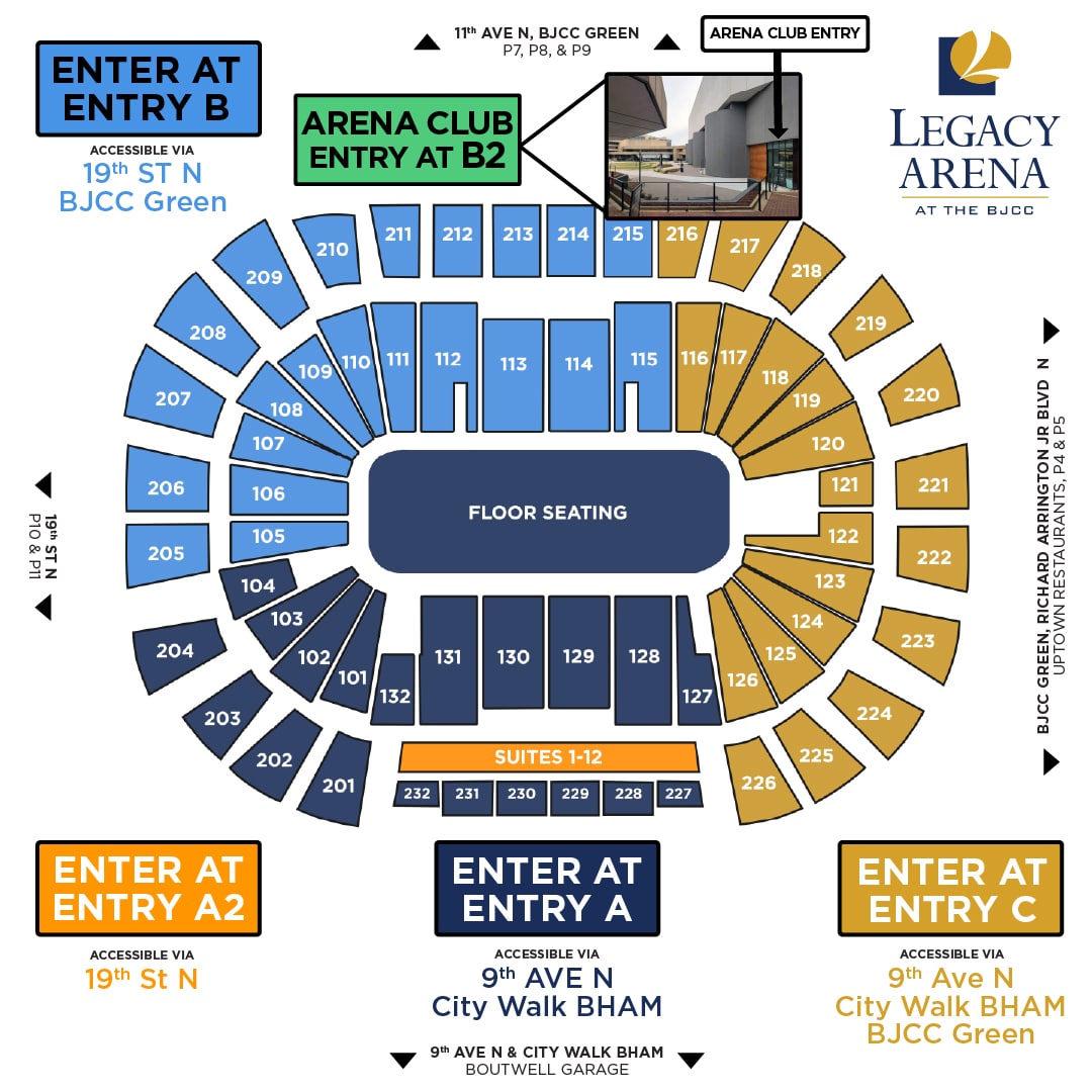 Entry A, Entry A2 and Entry B are all accessible entrances into Legacy Arena. There are entry ramps located specifically at Entry A2 and Entry B. In an effort to help guests enter the closest gate to their ticketed seats, please see below for the recommended gate entrances for each seating section: